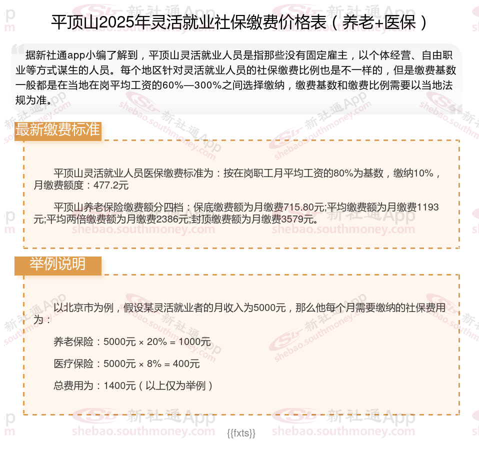 据新社通app数据显示,平顶山灵活就业养老保险的缴费基数为:3579元。灵活就业人员参保缴费的比例为个人20%。