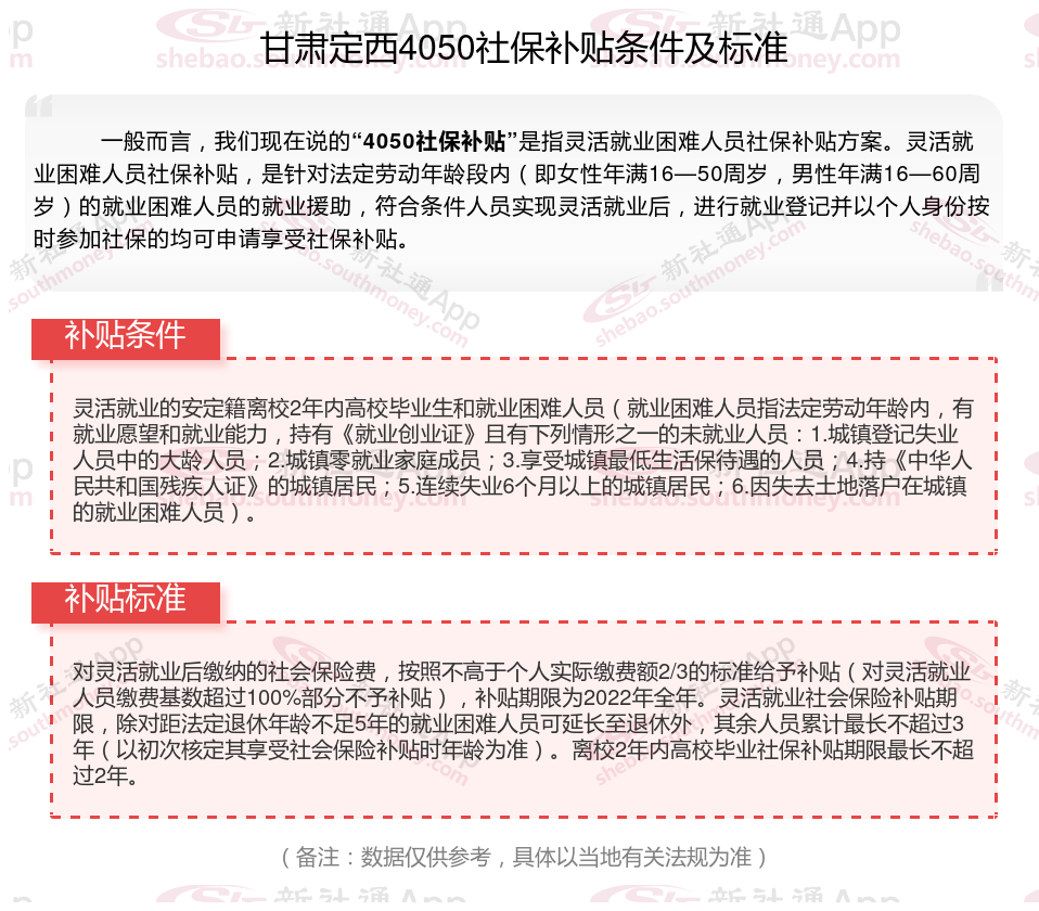 二、2025年甘肃定西4050社保补贴标准及条件,最新如下: