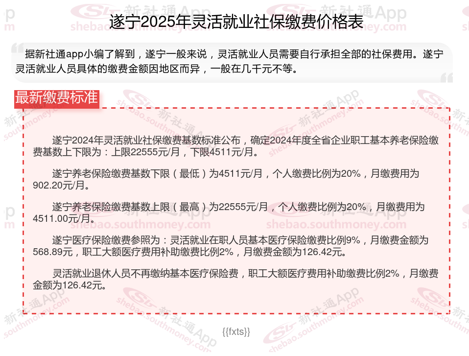 据新社通app数据显示,2024-2025年遂宁灵活就业人员养老保险的缴费标准:
