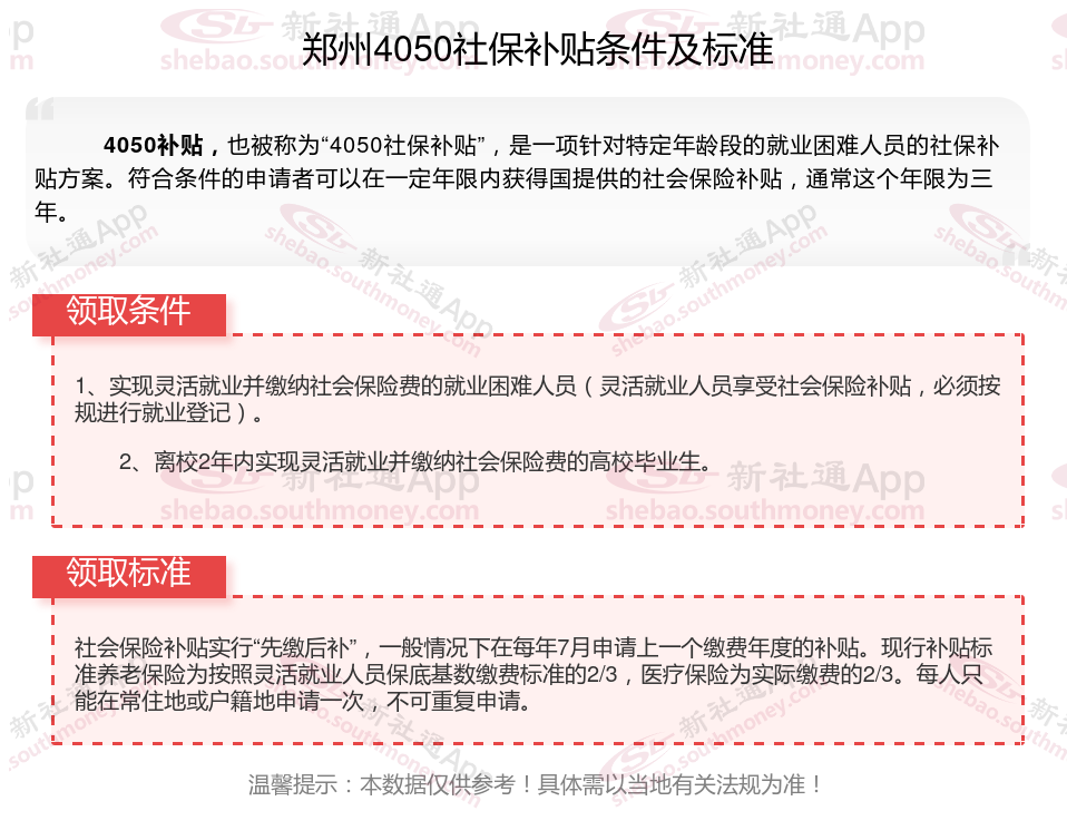 一、2025年郑州4050社保补贴标准及条件是多少?