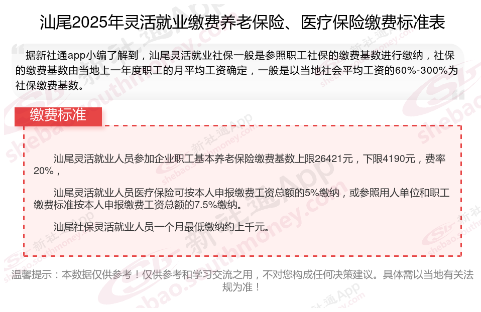 汕尾灵活就业人员基本养老保险缴费基数暂按不低于4190元;