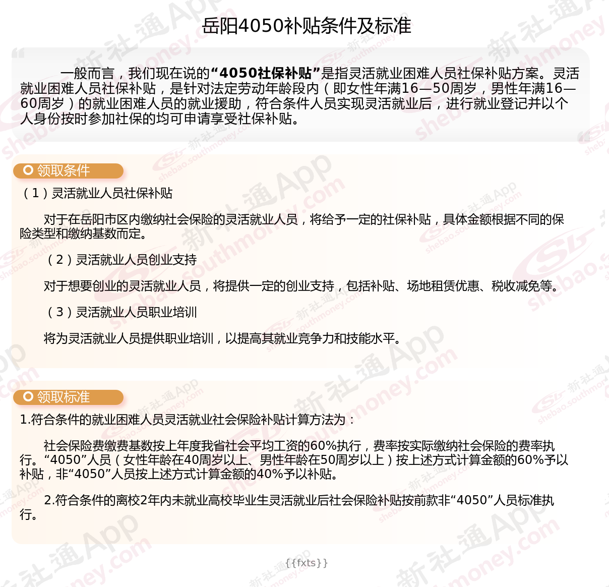 “灵活就业4050社保补贴”需要以灵活就业身份参加职工养老和医疗保险,补贴标准不超过实际缴费的三分之二,最长3年,距离退休不足5年的可延长到退休。补贴对象包括国企下岗人员、低保家庭等。申请流程需要提交身份证、银行账户等。那么岳阳4050灵活就业困难人员社保补贴标准是多少?岳阳4050社保补贴需要符合什么条件?接下来随新社通APP小编具体了解一下4050社保补贴内容。