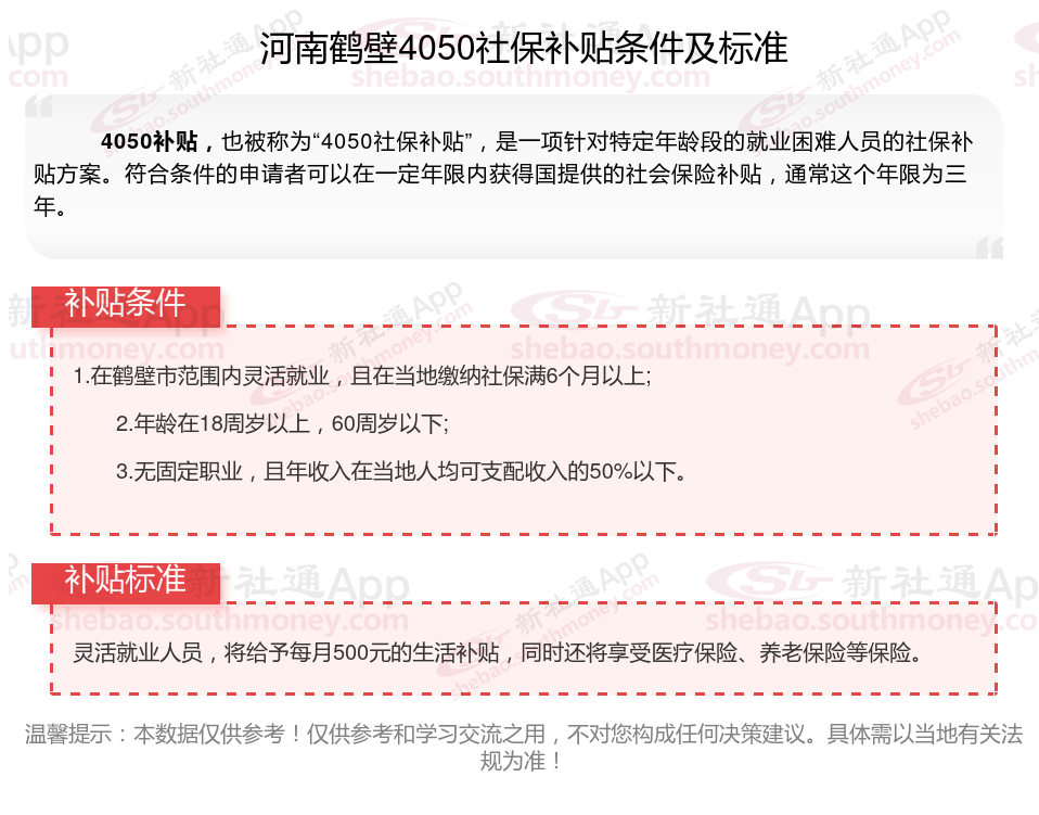 今天聊一下4050补贴话题。4050补贴听起来像是一个针对特定年龄人群的社保补贴。比如女性需年满40周岁,男性需年满50周岁(以申请当年12月31日为截止日期)。那么河南鹤壁4050灵活就业社保补贴标准是多少钱?河南鹤壁4050社保补贴条件是什么?接下来随新社通APP小编了解一下最新资讯。