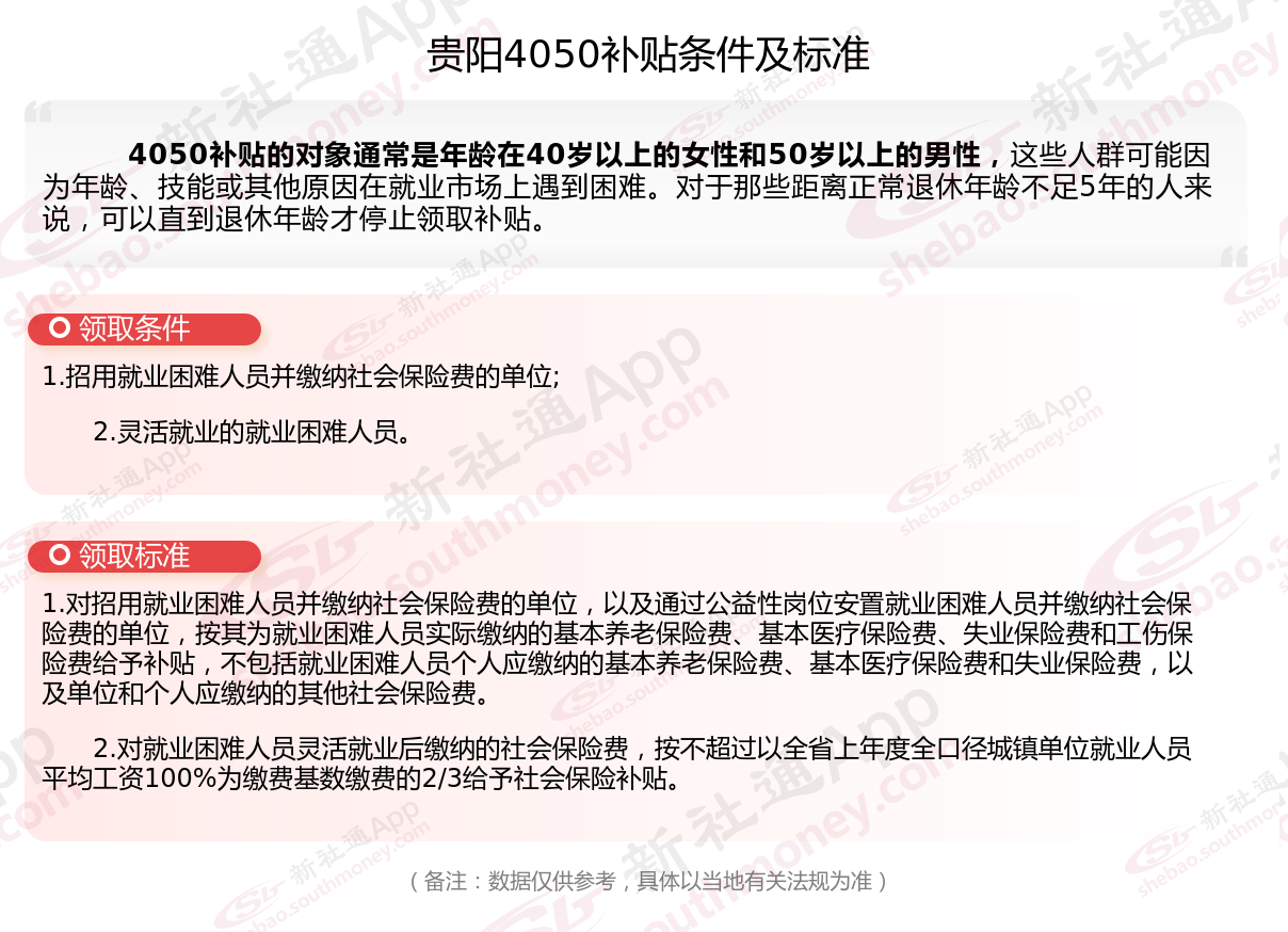 贵阳4050灵活就业社保补贴是什么?今天聊一下4050补贴话题。44050社保补贴标准据新社通app小编了解,通常,4050社保补贴包含基本医疗保险和基本养老保险两个险种,社保补贴金额为申请人实际缴纳基本养老保险和基本医疗保险金额的2/3,具体标准以当地社保局公布的数据为准!那么贵阳4050灵活就业社保补贴标准是多少钱?贵阳4050社保补贴可以领取多少?接下来随新社通APP小编了解一下贵阳4050灵活就业社保补贴的最新资讯。
