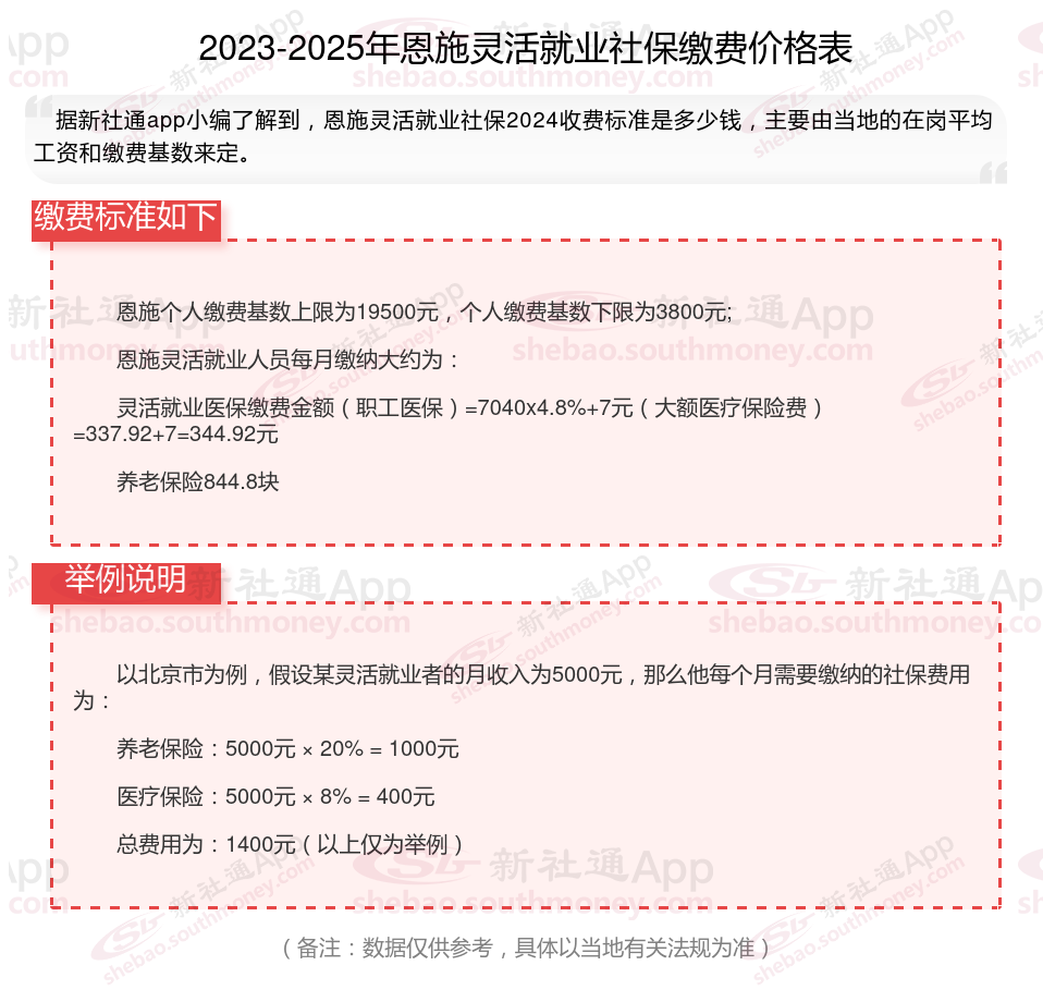 那么,恩施灵活就业人员社保交多少钱?买根据新社通app-社保缴费查询工具提供的2025社保缴费标准详情数据: