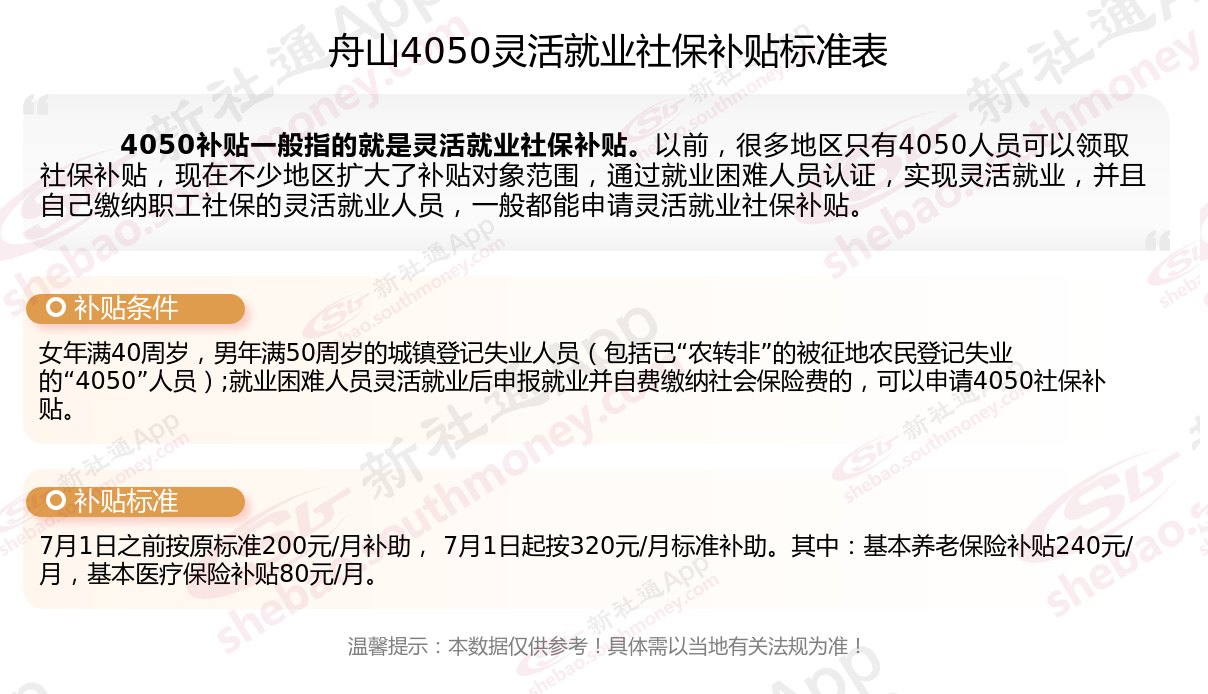 舟山4050灵活就业社保补贴是什么?今天聊一下4050补贴话题。4050补贴听起来像是一个针对特定年龄人群的社保补贴。比如女性需年满40周岁,男性需年满50周岁(以申请当年12月31日为截止日期)。那么舟山4050灵活就业社保补贴标准是多少钱?舟山4050社保补贴可以领取多少?接下来随新社通APP小编了解一下舟山4050灵活就业社保补贴的最新资讯。