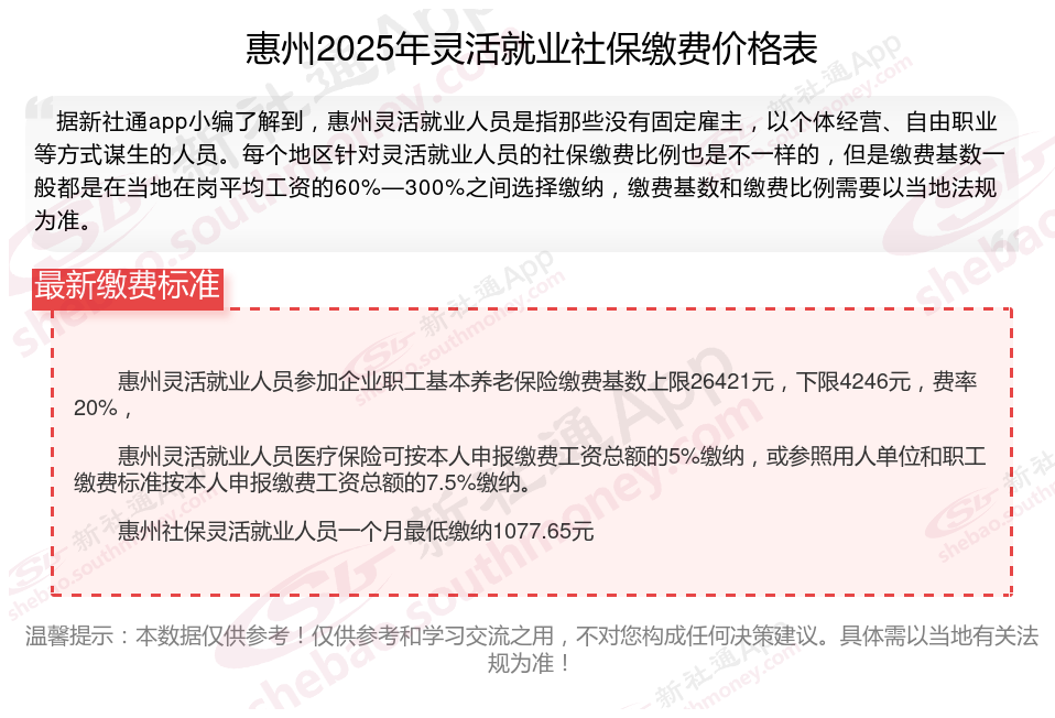 惠州灵活就业人员参加企业职工基本养老保险缴费基数上限26421元,下限4246元,费率20%,