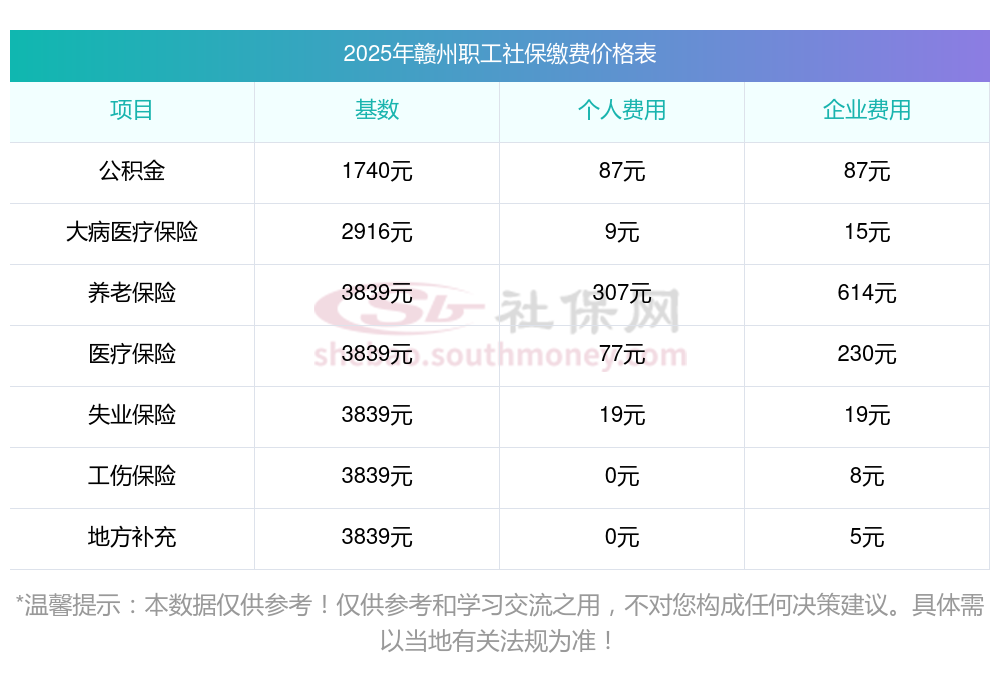 江西赣州缴费社保比例一览 社保公司和个人各交多少?下表是2024-2025年江西赣州社保费用明细参考,新社通app-社保缴费查询工具提供的最新数据如下: