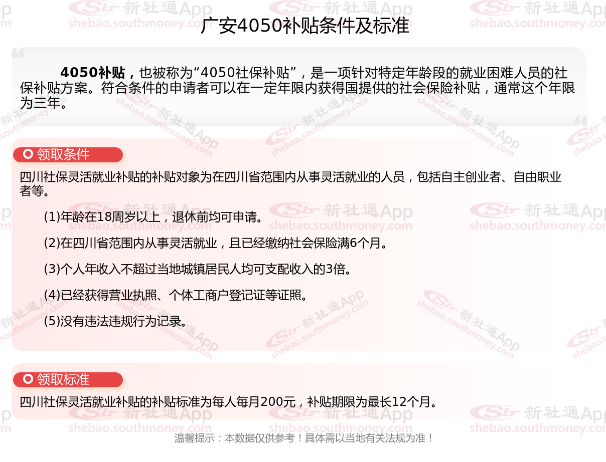 “灵活就业4050社保补贴”需要以灵活就业身份参加职工养老和医疗保险,补贴标准不超过实际缴费的三分之二,最长3年,距离退休不足5年的可延长到退休。补贴对象包括国企下岗人员、低保家庭等。申请流程需要提交身份证、银行账户等。那么广安4050灵活就业困难人员社保补贴标准是多少?广安4050社保补贴需要符合什么条件?接下来随新社通APP小编具体了解一下4050社保补贴内容。