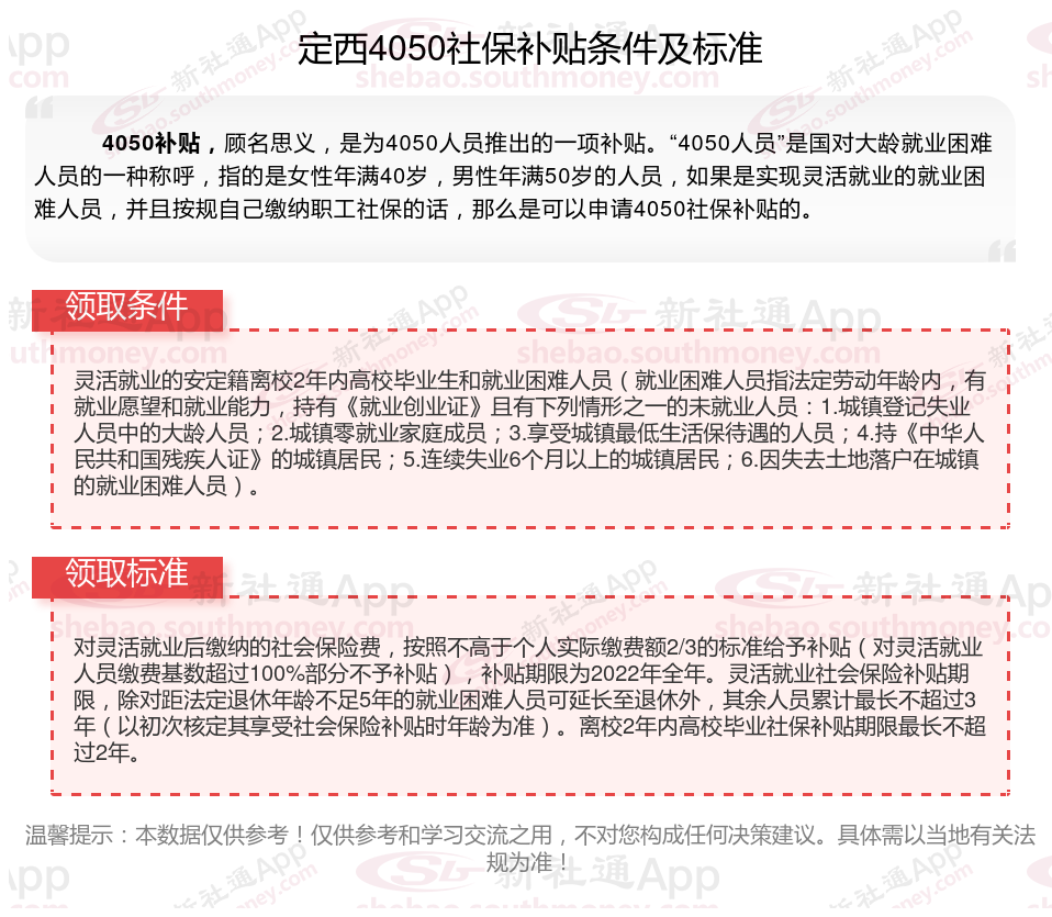一、2023-2024年定西4050社保补贴标准及条件是多少?