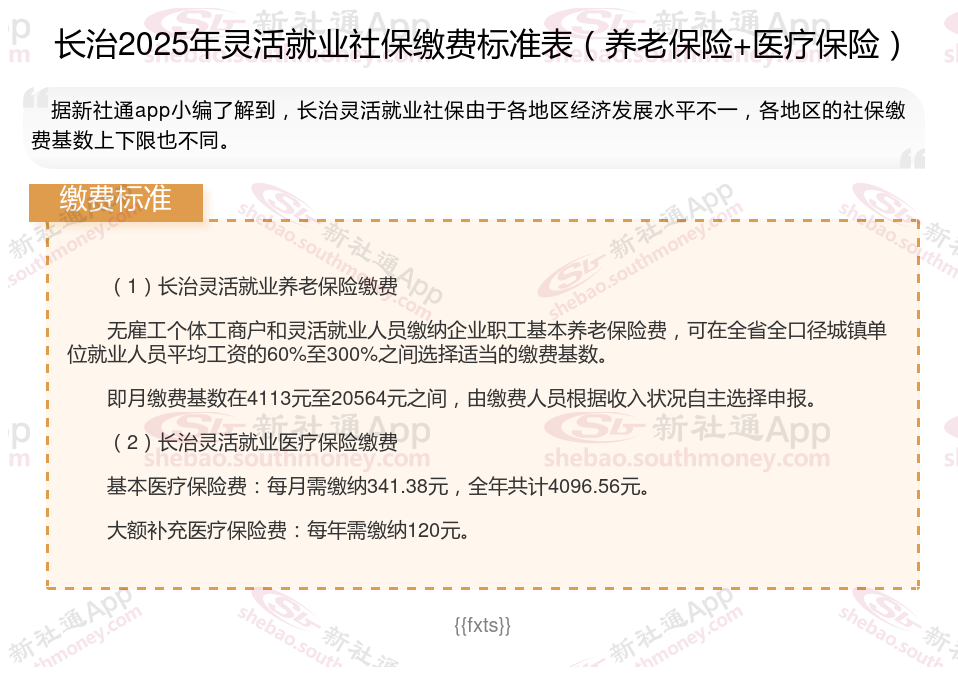 据新社通app数据显示,长治灵活就业人员养老缴费基数2024-2025年最新标准如下: