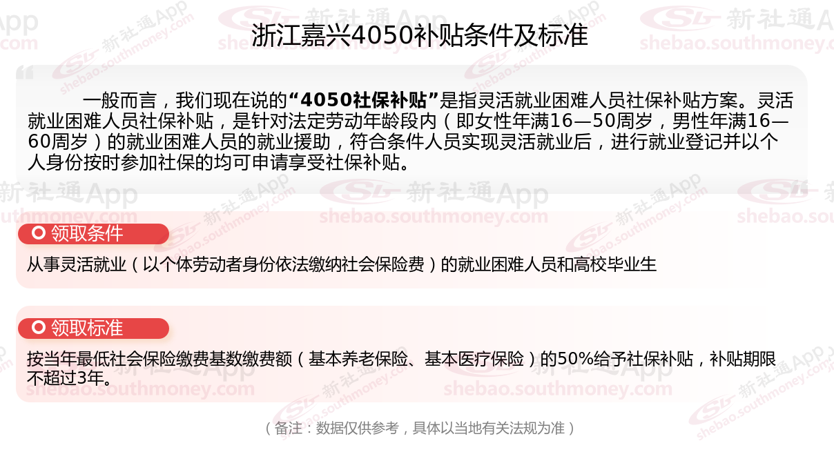 一、2025年浙江嘉兴4050社保补贴标准及条件是多少?