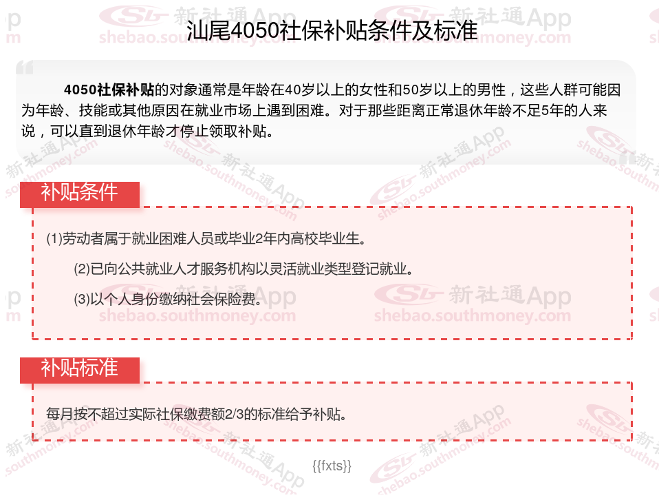 4050补贴需要以灵活就业身份参加职工养老和医疗保险,补贴标准不超过实际缴费的三分之二,最长3年,距离退休不足5年的可延长到退休。补贴对象包括国企下岗人员、低保家庭等。申请流程需要提交身份证、银行账户等。那么汕尾4050灵活就业社保补贴标准是多少钱?汕尾4050社保补贴条件是什么?接下来随新社通APP小编了解一下最新资讯。