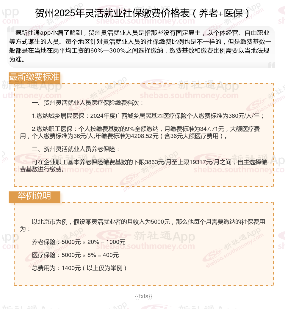据新社通app数据显示,贺州灵活就业养老保险的缴费基数为:4053.6元。灵活就业人员参保缴费的比例为个人20%。