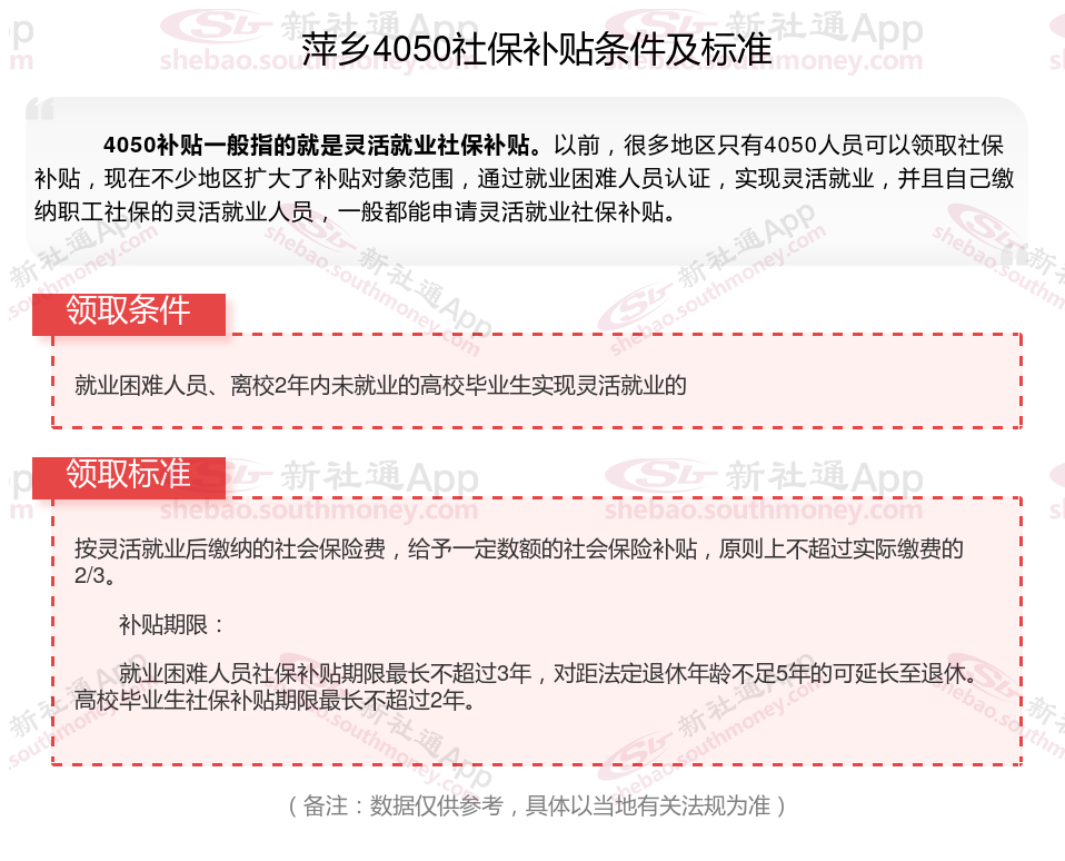 4050社保补贴标准据新社通app小编了解,通常,4050社保补贴包含基本医疗保险和基本养老保险两个险种,社保补贴金额为申请人实际缴纳基本养老保险和基本医疗保险金额的2/3,具体标准以当地社保局公布的数据为准!那么萍乡灵活就业人员4050补贴最新标准是多少,萍乡4050灵活就业人员社保补贴一年可以有多少钱?接下来随新社通APP小编具体了解一下4050社保补贴内容。