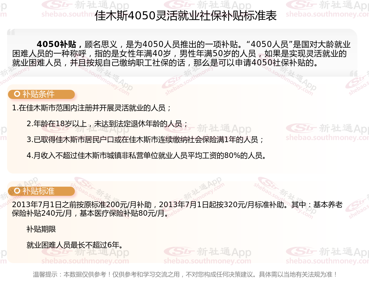 佳木斯4050灵活就业社保补贴是什么?今天聊一下4050补贴话题。4050补贴听起来像是一个针对特定年龄人群的社保补贴。比如女性需年满40周岁,男性需年满50周岁(以申请当年12月31日为截止日期)。那么佳木斯4050灵活就业社保补贴标准是多少钱?佳木斯4050社保补贴可以领取多少?接下来随新社通APP小编了解一下佳木斯4050灵活就业社保补贴的最新资讯。