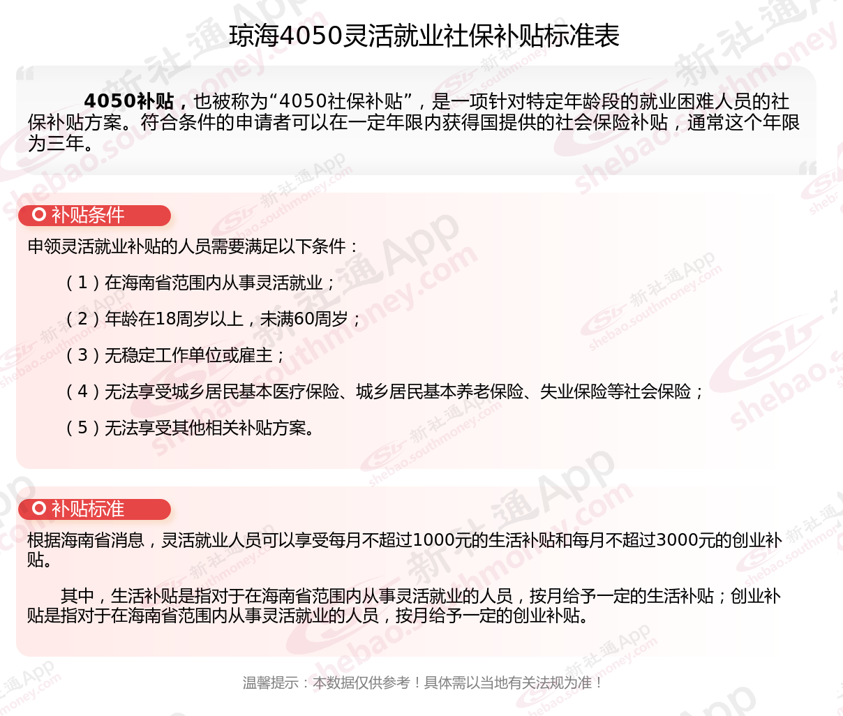 “4050人员”是国对大龄就业困难人员的一种称呼,指的是女性年满40岁,男性年满50岁的人员,那么琼海4050灵活就业社保补贴标准是多少钱?琼海4050社保补贴条件是什么?接下来随新社通APP小编了解一下最新资讯。
