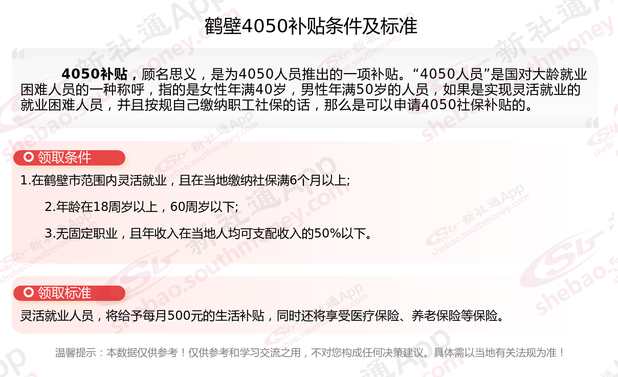 4050社保补贴标准据新社通app小编了解,通常,4050社保补贴包含基本医疗保险和基本养老保险两个险种,社保补贴金额为申请人实际缴纳基本养老保险和基本医疗保险金额的2/3,具体标准以当地社保局公布的数据为准!那么鹤壁灵活就业人员4050补贴最新标准是多少,鹤壁4050灵活就业人员社保补贴一年可以有多少钱?接下来随新社通APP小编具体了解一下4050社保补贴内容。