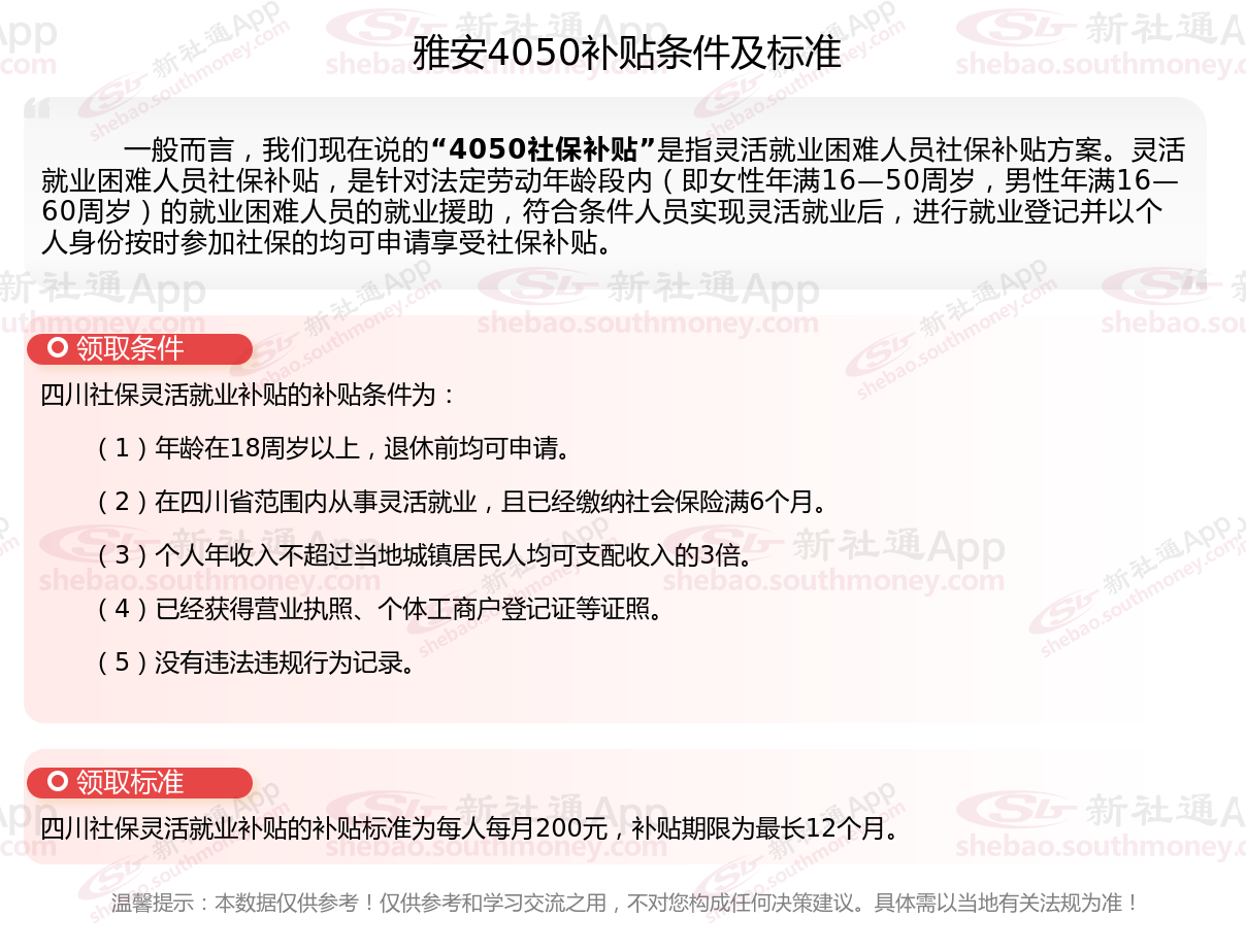 三、雅安灵活就业4050社保补贴标准及条件是什么