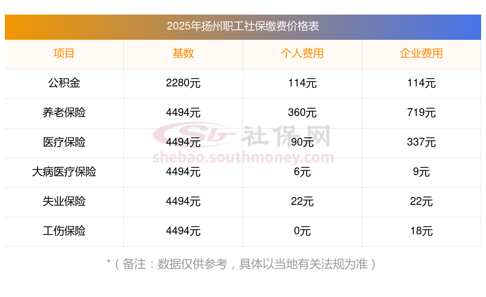 2025年扬州社保缴费多少钱?下表是2024-2025年扬州社保费用明细参考,新社通app-社保缴费查询工具提供的最新数据如下: