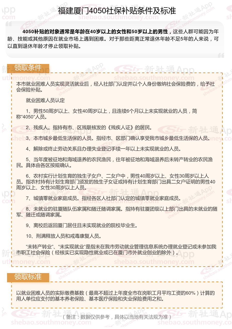 今天聊一下4050补贴的相关内容。4050补贴听起来像是一个针对特定年龄人群的社保补贴。比如女性需年满40周岁,男性需年满50周岁(以申请当年12月31日为截止日期)。那么福建厦门4050灵活就业困难人员社保补贴多少钱?福建厦门4050社保补贴可以申请吗?接下来随新社通APP小编具体了解一下4050社保补贴内容。