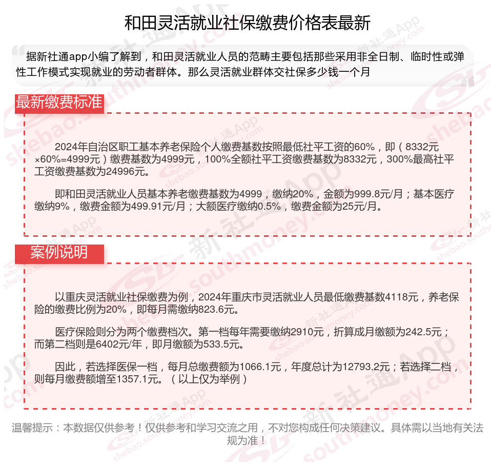 据新社通app数据显示,和田灵活就业养老保险缴费基数2024-2025年最新标准如下: