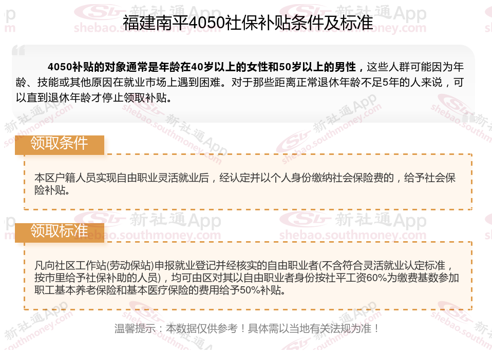 一、2025年福建南平灵活就业4050社保补贴标准及条件是什么