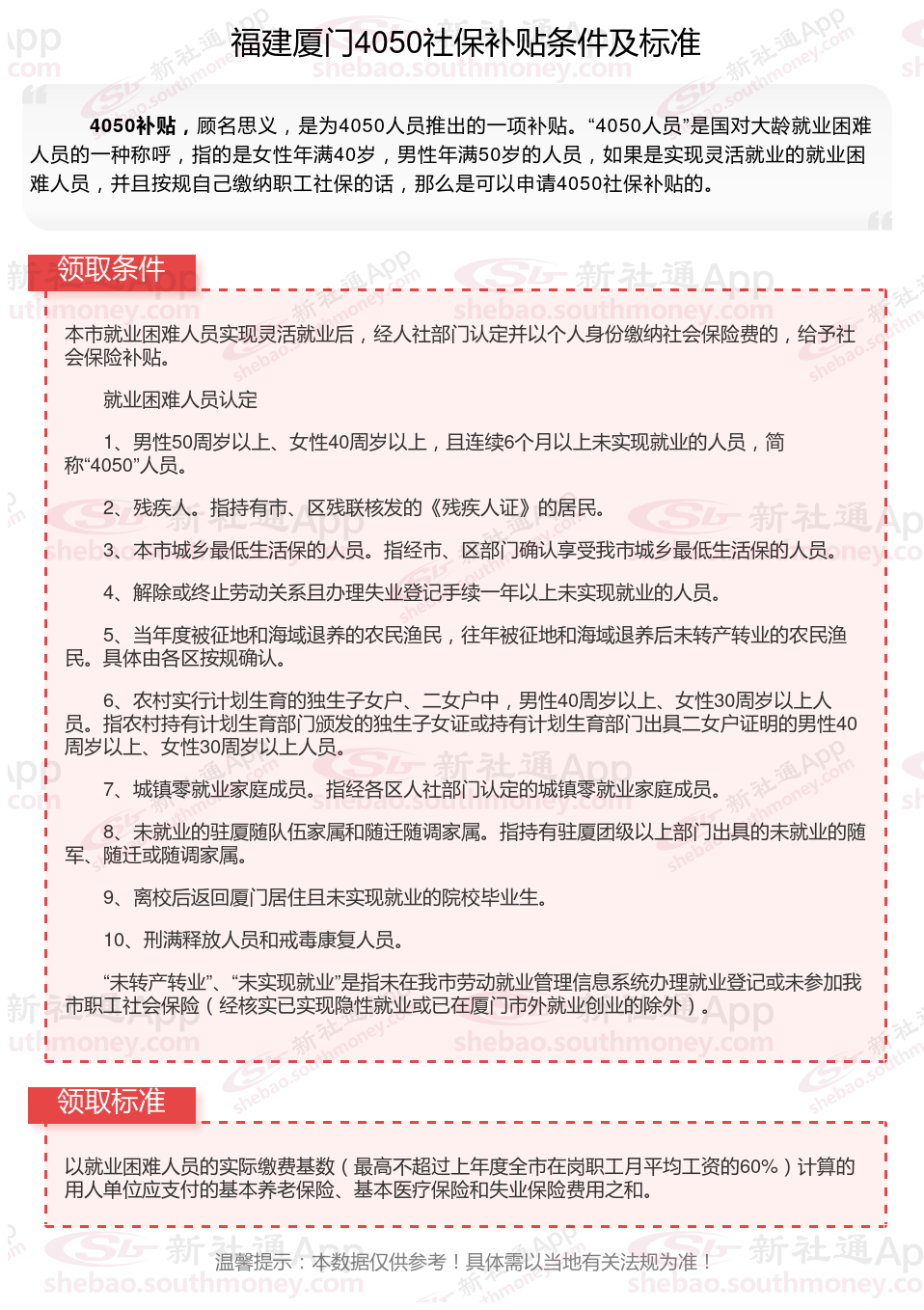 一、福建厦门4050社保补贴标准及条件2025年最新消息