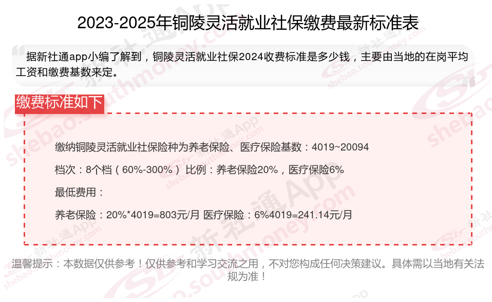 那么,铜陵自己社保一个月多少钱?根据新社通app-社保缴费查询工具提供的2025社保缴费标准详情数据: