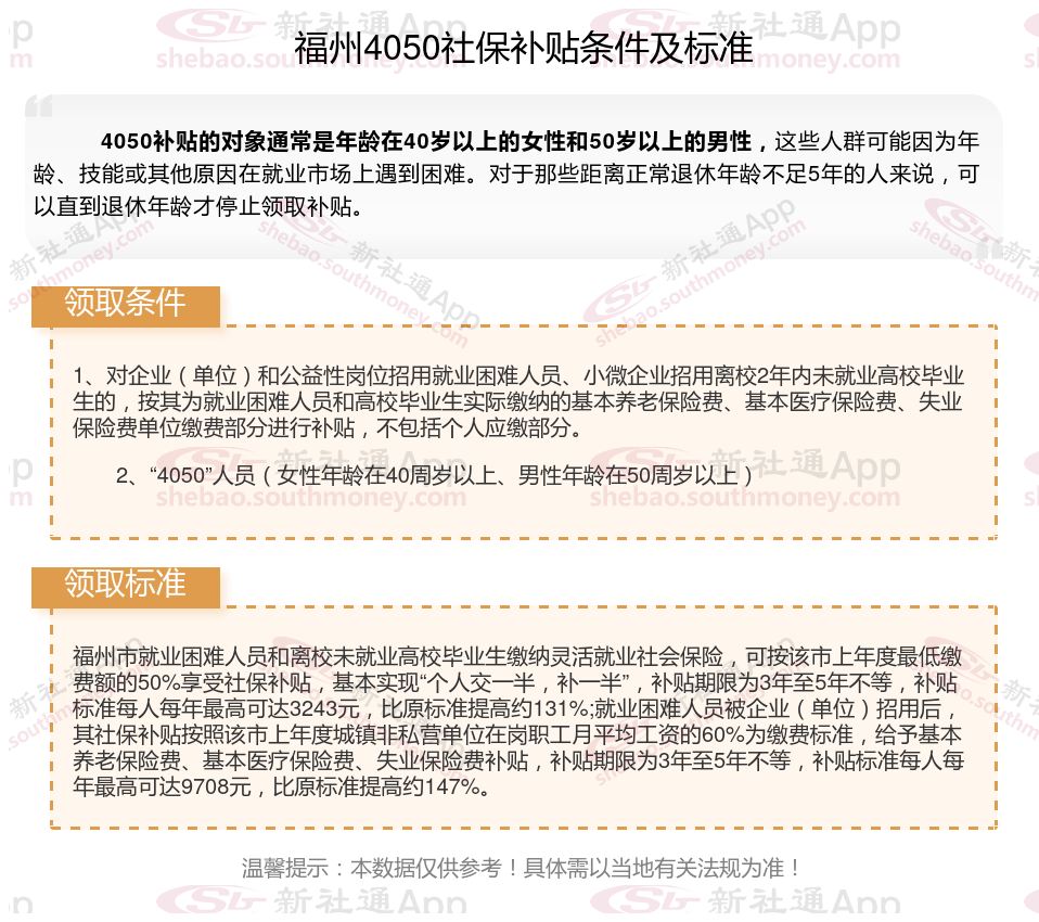 今天聊一下4050补贴的相关内容。4050补贴听起来像是一个针对特定年龄人群的社保补贴。比如女性需年满40周岁,男性需年满50周岁(以申请当年12月31日为截止日期)。那么福州4050灵活就业困难人员社保补贴多少钱?福州4050社保补贴可以申请吗?接下来随新社通APP小编具体了解一下4050社保补贴内容。