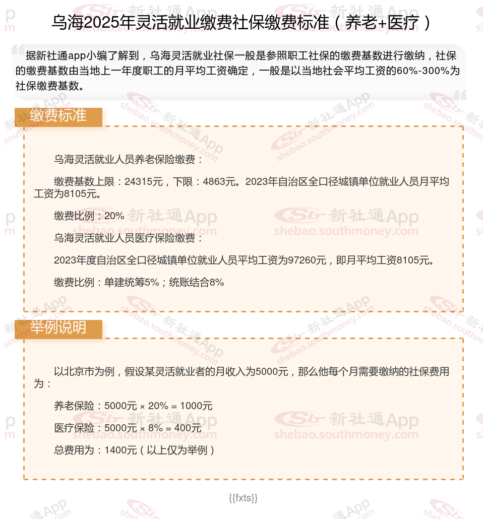 据新社通app数据显示,2024-2025年乌海灵活就业人员养老保险的缴费标准: