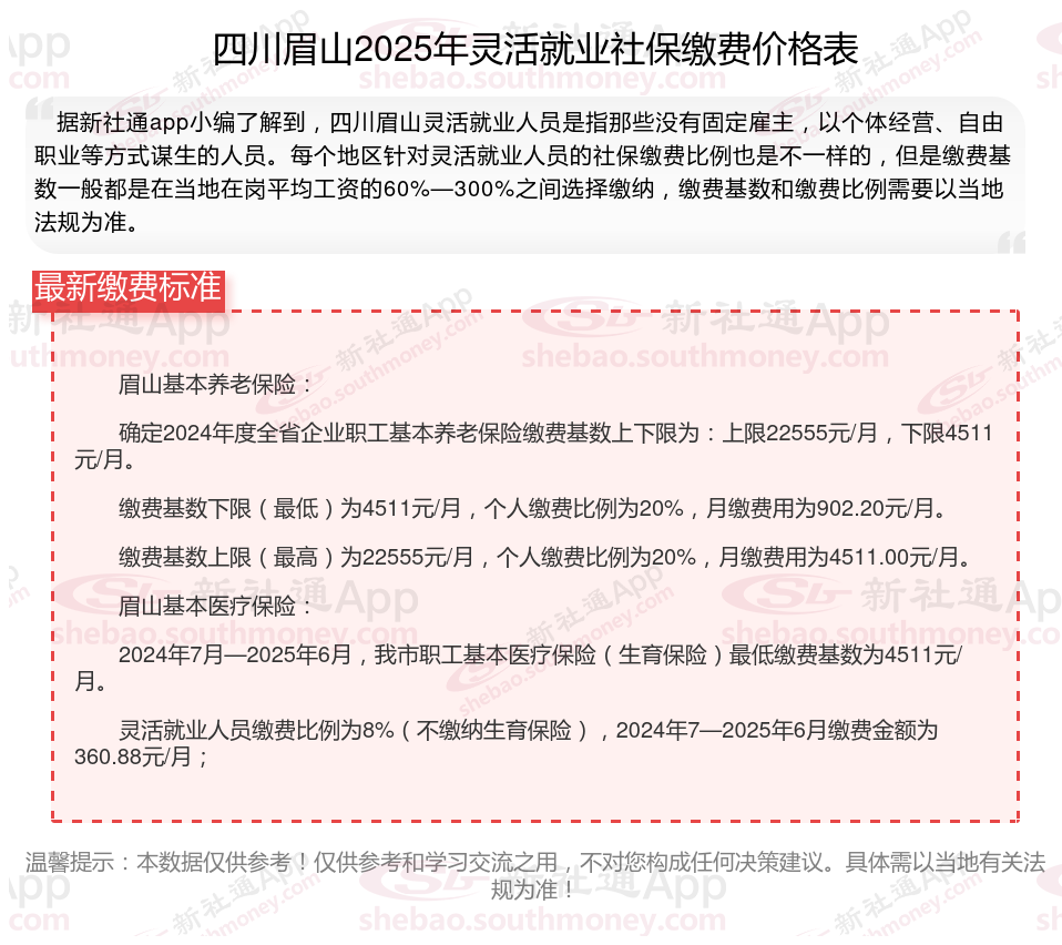 据新社通app数据显示,四川眉山灵活就业养老缴费基数明细如下: