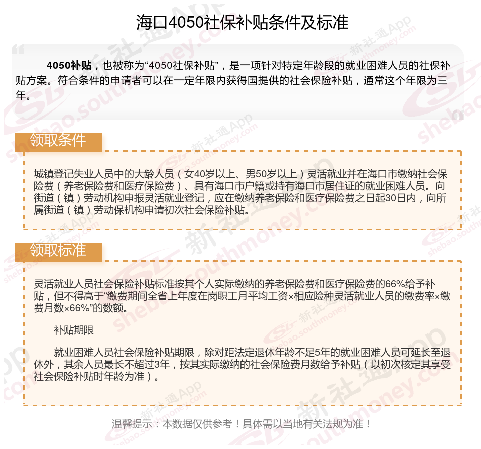 4050社保补贴标准据新社通app小编了解,通常,4050社保补贴包含基本医疗保险和基本养老保险两个险种,社保补贴金额为申请人实际缴纳基本养老保险和基本医疗保险金额的2/3,具体标准以当地社保局公布的数据为准!那么海口4050灵活就业困难人员社保补贴标准是多少?海口4050社保补贴需要符合什么条件?接下来随新社通APP小编具体了解一下4050社保补贴内容。