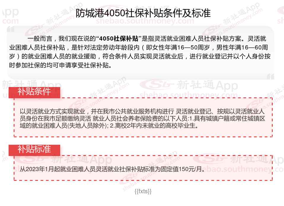 二、2025年防城港4050社保补贴标准(防城港4050灵活就业人员补贴标准是多少钱?防城港2025年4050补贴新规能领多少钱?)