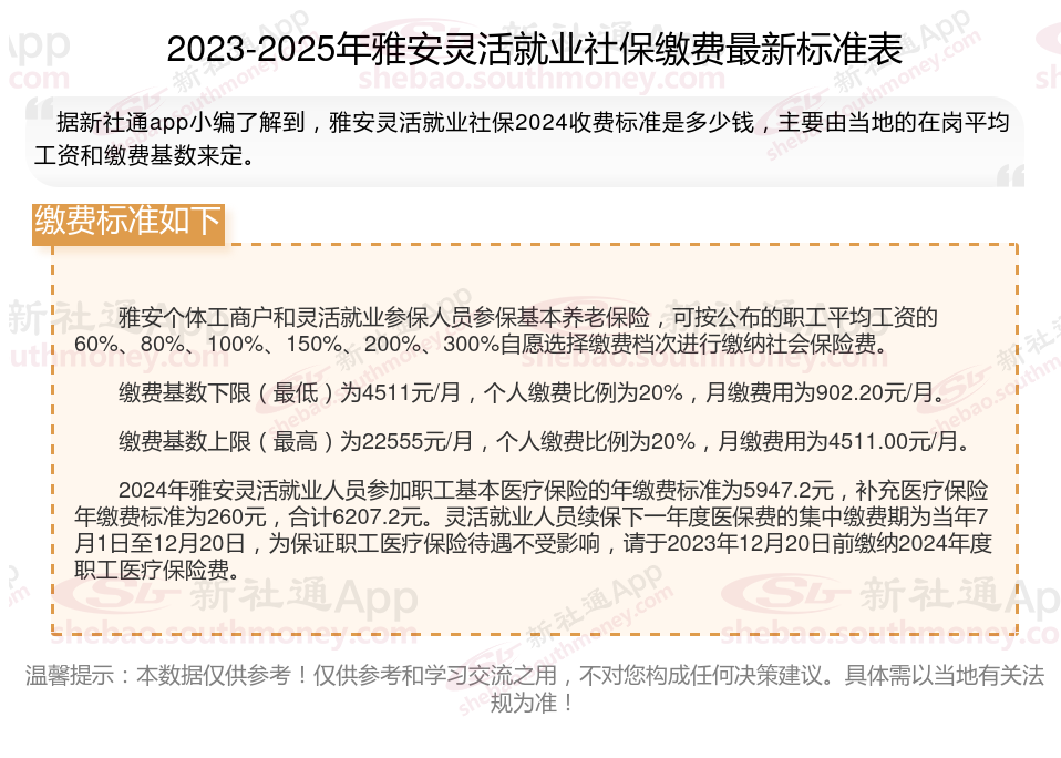 据新社通app数据显示,雅安灵活就业养老保险最低缴费基数为:4511元;个人的缴费比例分别为:20%;