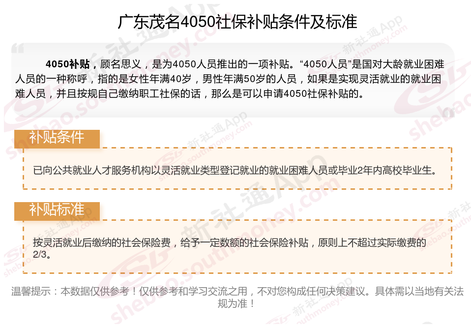 “灵活就业4050社保补贴”主要是针对大龄就业困难人群的社保补贴,申请条件包括年龄、就业困难、灵活就业并自费缴纳社保,需要持有失业登记证,不同地区可能有细微差别,比如农村户口的限制。那么广东茂名4050灵活就业困难人员社保补贴标准是多少?广东茂名4050社保补贴需要符合什么条件?接下来随新社通APP小编具体了解一下4050社保补贴内容。
