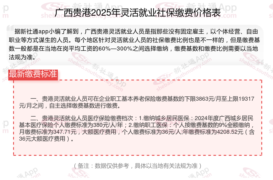 据新社通app数据显示,广西贵港灵活就业养老保险最低缴费基数为:4053.6元;个人的缴费比例分别为:20%;