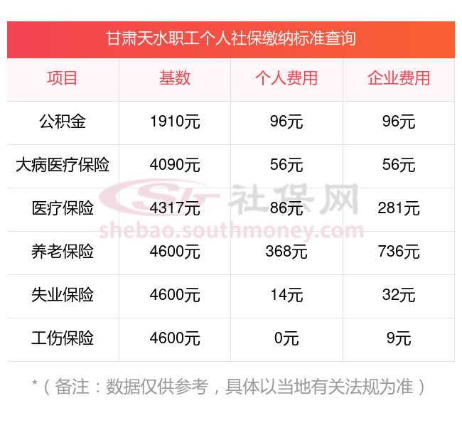 2025年社保缴费价目表,下面和新社通一起来了解下2024-2025年甘肃天水最低配社保费用明细参考,新社通app-社保缴费查询工具提供的最新数据如下: