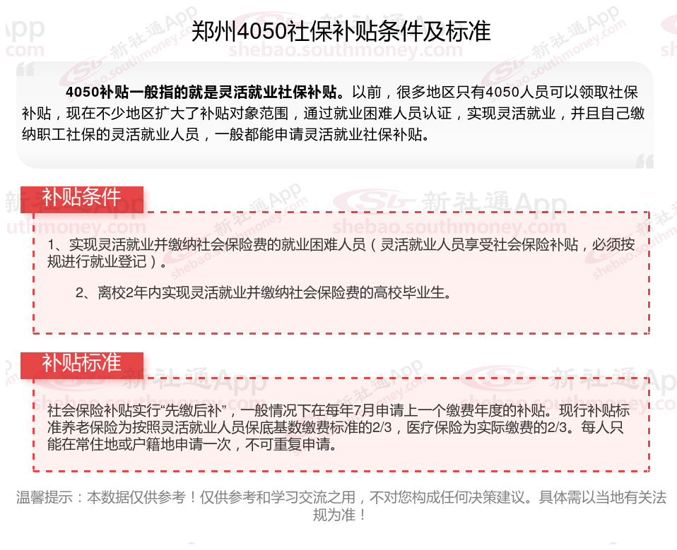 4050补贴主要是针对大龄就业困难人群的社保补贴,申请条件包括年龄、就业困难、灵活就业并自费缴纳社保,需要持有失业登记证,不同地区可能有细微差别,比如农村户口的限制。那么郑州4050灵活就业社保补贴标准是多少钱?郑州4050社保补贴条件是什么?接下来随新社通APP小编了解一下最新资讯。