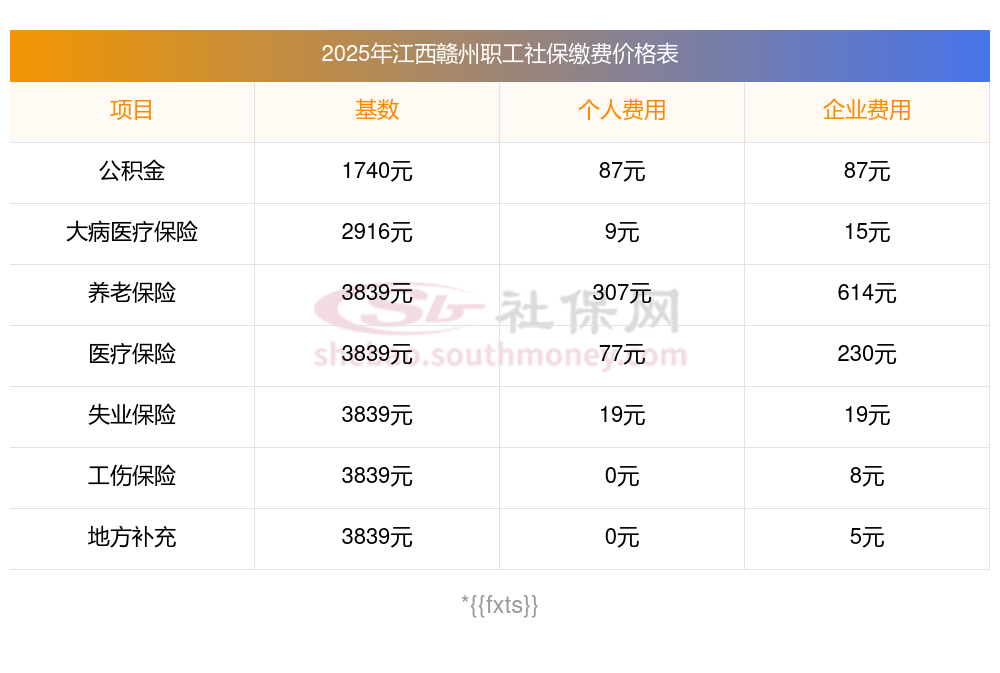 江西赣州2025年社保养老保险缴费标准是多少?下表是2025年江西赣州社保费用明细参考,新社通app-社保缴费查询工具提供的最新数据如下: