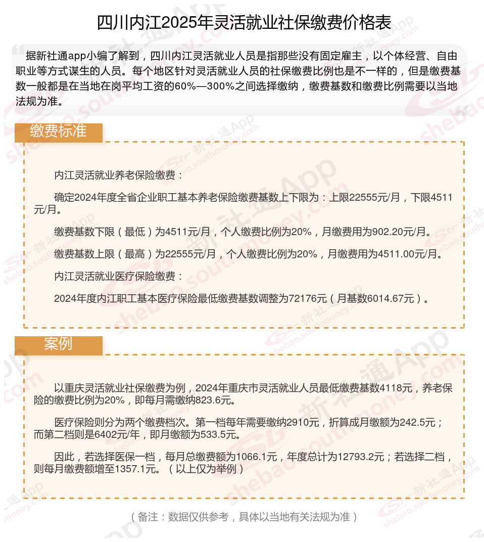 据新社通app数据显示,四川内江灵活就业人员养老保险缴费基数2024-2025年最新标准如下: