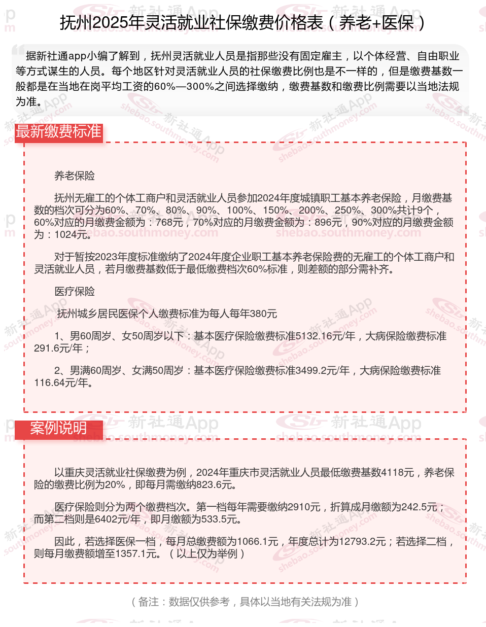 据新社通app数据显示,抚州灵活就业人员养老缴费基数2024-2025年最新标准如下: