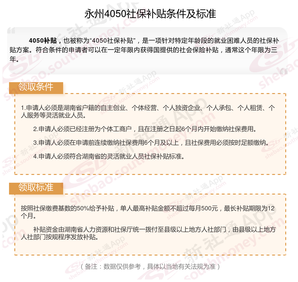 “灵活就业4050社保补贴”需要以灵活就业身份参加职工养老和医疗保险,补贴标准不超过实际缴费的三分之二,最长3年,距离退休不足5年的可延长到退休。补贴对象包括国企下岗人员、低保家庭等。申请流程需要提交身份证、银行账户等。那么永州4050灵活就业困难人员社保补贴标准是多少?永州4050社保补贴需要符合什么条件?接下来随新社通APP小编具体了解一下4050社保补贴内容。
