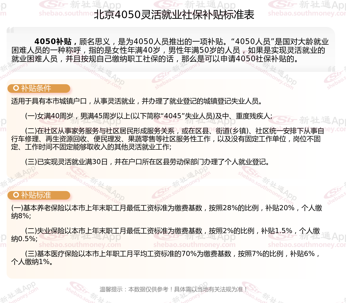 一、2025年北京灵活就业4050社保补贴标准及条件是什么(灵活就业4050社保补贴多少钱)