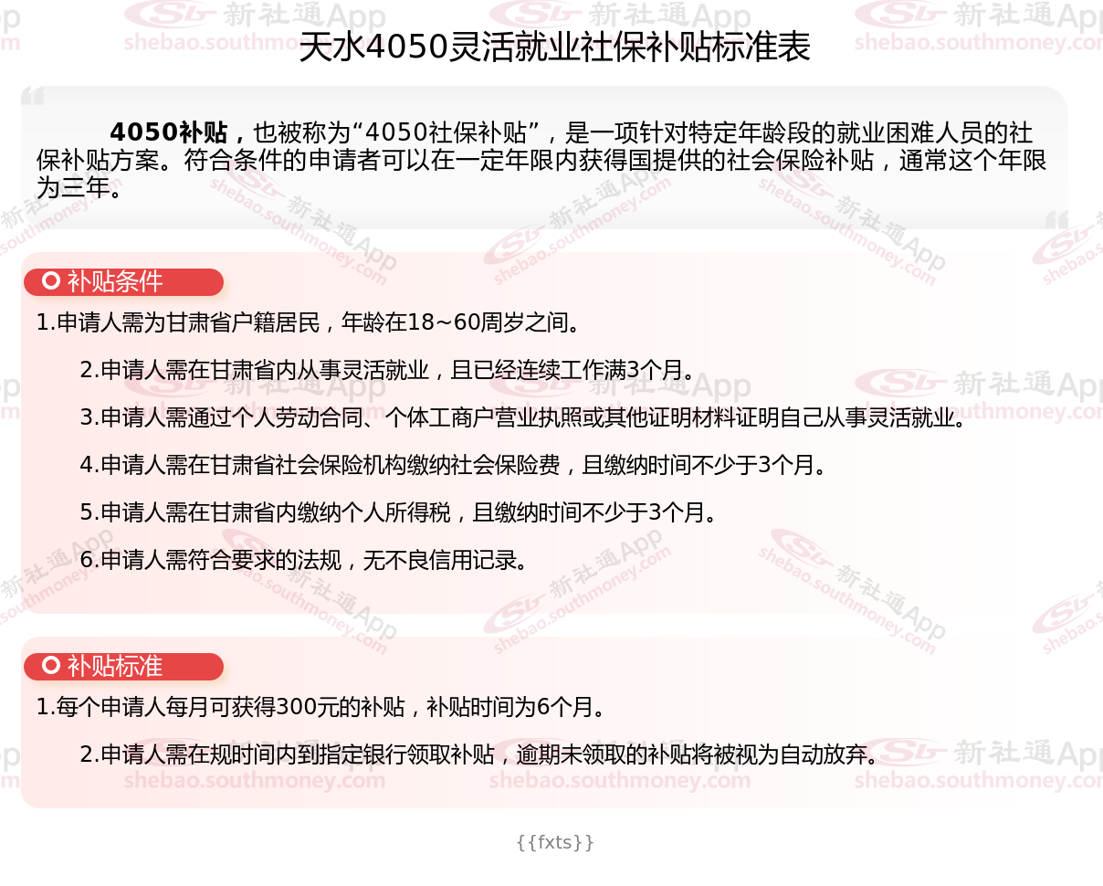 天水4050灵活就业社保补贴标准如何?“4050补贴”需要以灵活就业身份参加职工养老和医疗保险,补贴标准不超过实际缴费的三分之二,最长3年,距离退休不足5年的可延长到退休。补贴对象包括国企下岗人员、低保家庭等。申请流程需要提交身份证、银行账户等。那么天水4050灵活就业社保补贴标准是多少钱?天水4050社保补贴条件是什么?接下来随新社通APP小编了解一下天水4050灵活就业社保补贴标准最新资讯。