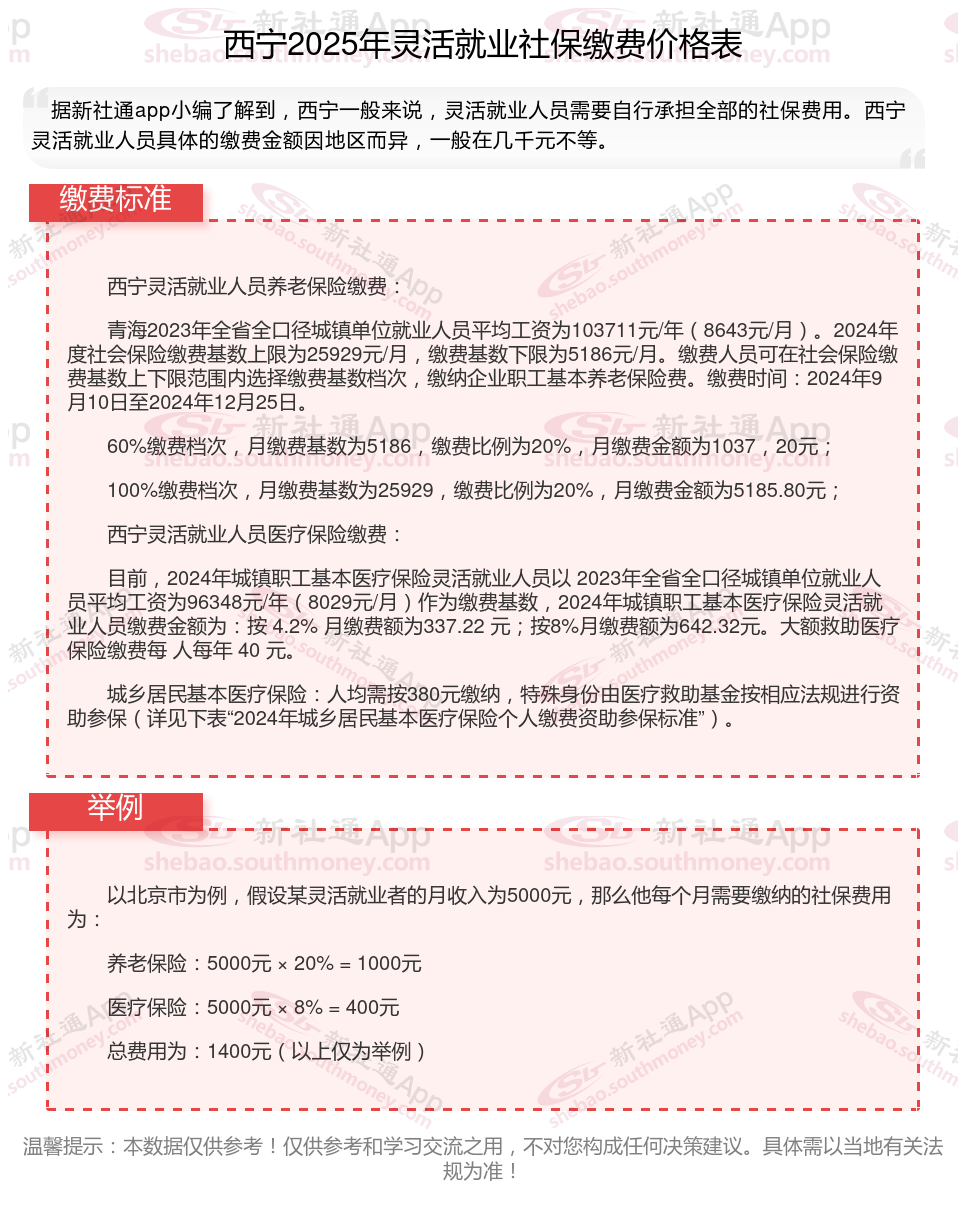 据新社通app数据显示,西宁灵活就业养老保险的缴费基数为:5186元。灵活就业人员参保缴费的比例为个人20%。