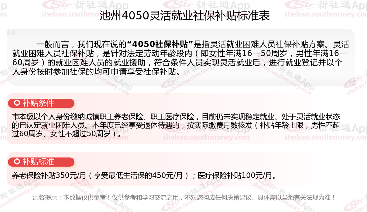 4050补贴需要以灵活就业身份参加职工养老和医疗保险,补贴标准不超过实际缴费的三分之二,最长3年,距离退休不足5年的可延长到退休。补贴对象包括国企下岗人员、低保家庭等。申请流程需要提交身份证、银行账户等。那么池州4050灵活就业社保补贴标准是多少钱?池州4050社保补贴条件是什么?接下来随新社通APP小编了解一下最新资讯。