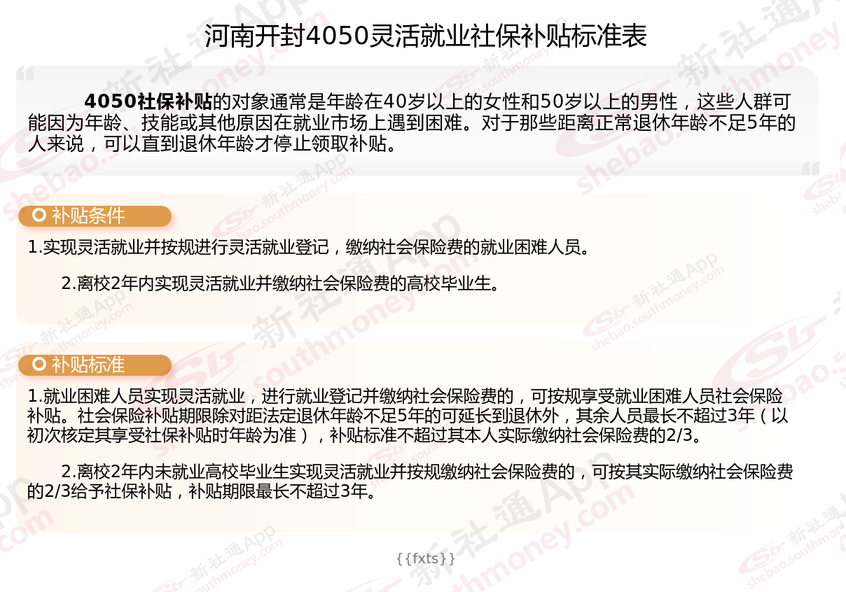 二、河南开封4050社保补贴标准及条件4050社保补贴,最新如下