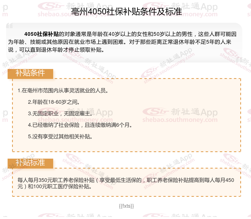 二、2025年亳州4050社保补贴标准及条件是什么?