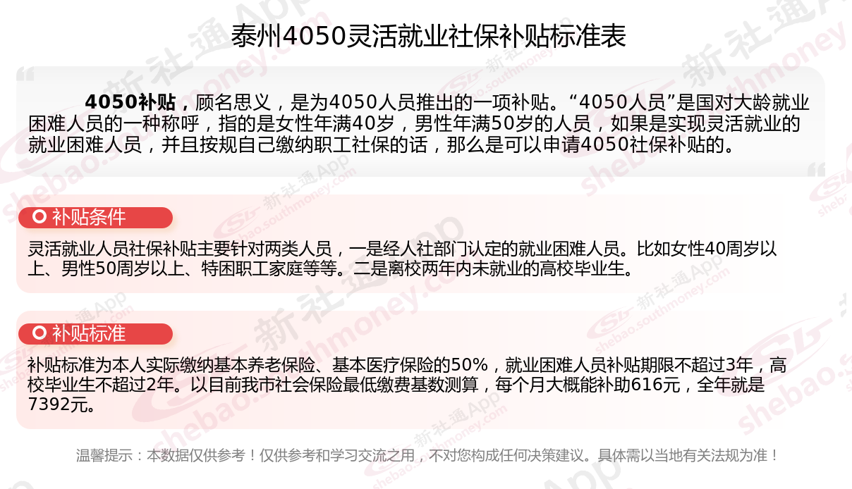 泰州4050灵活就业社保补贴标准如何?“4050补贴”需要以灵活就业身份参加职工养老和医疗保险,补贴标准不超过实际缴费的三分之二,最长3年,距离退休不足5年的可延长到退休。补贴对象包括国企下岗人员、低保家庭等。申请流程需要提交身份证、银行账户等。那么泰州4050灵活就业社保补贴标准是多少钱?泰州4050社保补贴条件是什么?接下来随新社通APP小编了解一下泰州4050灵活就业社保补贴标准最新资讯。